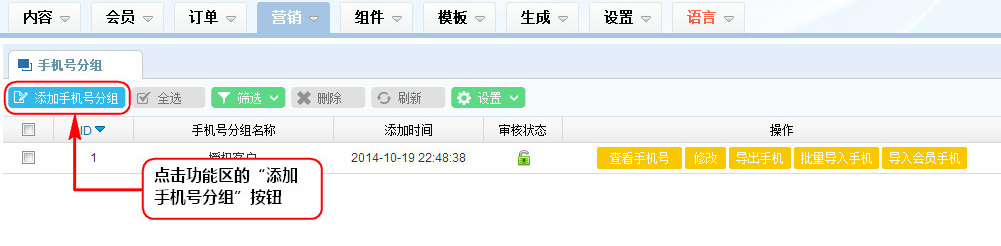 1、在手機(jī)號(hào)分組列表區(qū),點(diǎn)擊功能區(qū)的“添加手機(jī)號(hào)分組”按鈕;