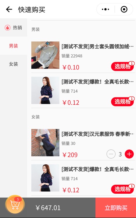 快速購買頁在小程序前端展示:
